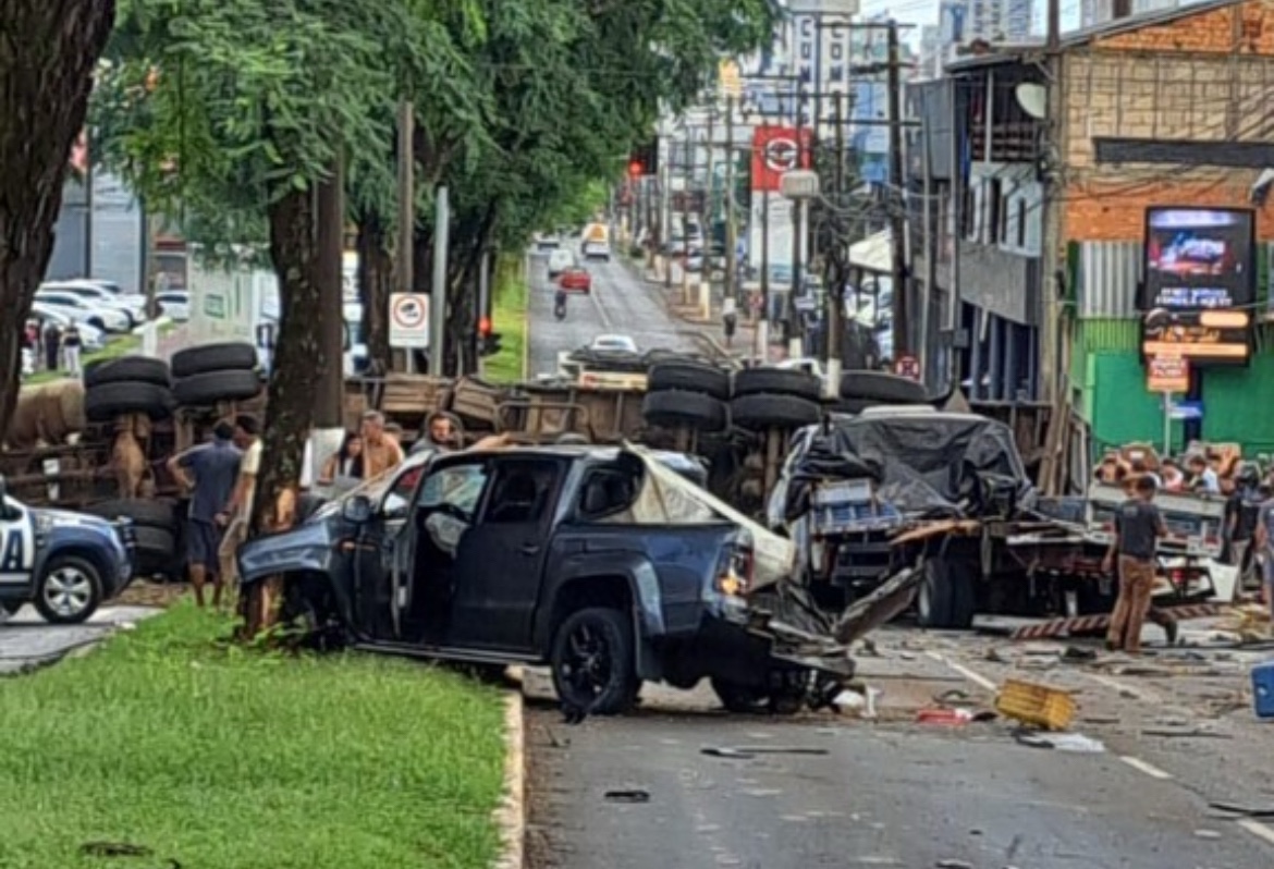 Imagens de câmeras de segurança e de monitoramento registraram o momento da colisão. Nos vídeos, os veículos trafegam pela via — uma das mais movimentadas da cidade — quando a carreta, carregada com madeira laminada e no mesmo sentido, atinge os carros pela parte traseira.